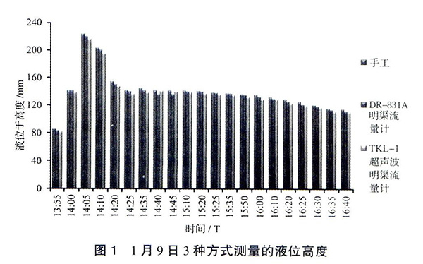 見圖3,以手工實測液位高度為基準,2種流量計的誤差均在±5%的范圍內。除在1月9日14∶40和14∶45兩個時間點測量值表現出DR-831A測量誤差高于TKL-Ⅰ外,其他時段都明顯表現出DR-831A測量誤差小于TKL-Ⅰ。