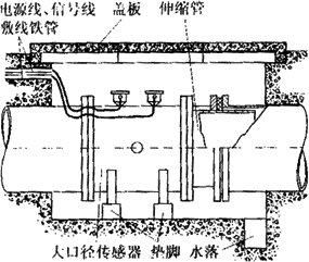 由于大口徑管道在多數(shù)場(chǎng)合下是埋在地下的,因此大口徑傳感器在安裝前應(yīng)做好水泥地坑。圖6-19所示是在給排水系統(tǒng)中常見的安裝形式。水泥地坑應(yīng)有足夠的活動(dòng)空間,側(cè)壁埋有敷設(shè)電纜的鋼管,上有蓋板防止雨淋,下有泄水管以免坑內(nèi)積水而使傳感器侵水。為了拆裝方便,傳感器應(yīng)放在墊腳上,且在下游側(cè)裝有活絡(luò)的伸縮管。圖6-20是105%發(fā)煙硫酸流量計(jì)在地下水泥管污水排放系統(tǒng)中的安裝實(shí)例。