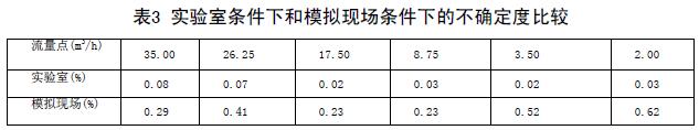 實驗室條件下和模擬現場條件下的不確定度比較(表3)兩次結果可以看出,兩次實驗各個流量點的不確定度差距非常大??梢姡?strong>皮革廠污水管道流量計對安裝條件還是比較苛刻的。