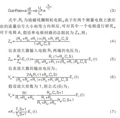 提出在硬件電路上加入模擬開關, 干擾尖峰到來時斷開模擬開關避免干擾進入后級電路,尖峰過去重新打開模擬開關;K.Saito 等提出漂移校正法,先以高勵磁頻率進行勵磁,在勵磁過程中插入低勵磁頻率提取用于漂移校正的非固定微分噪聲分量,但在插入的低勵磁頻率段漿液噪聲較大且很難將漿液噪聲與流量信號分離,此時的校正因子非單純的非固定噪聲分量,改進措施是長時間取平均值得到穩(wěn)定因子。 傳統(tǒng)方法是同步采樣保持法,即在磁場穩(wěn)定階段采樣。 其他消除干擾的方法有設置干擾補償機構、控制勵磁電流變化率減小干擾幅值、矩形波代替梯形波、希爾伯特黃變換結合傅里葉變換和程控增益技術等。經(jīng)上述對現(xiàn)有的文獻分析與總結可知, 當前消除微分噪聲主要從信號處理方面入手,并未對影響噪聲的因素加以研究。 本文建立電極測量回路等效模型,給出仿真模型搭建、參數(shù)取值和仿真結果分析。