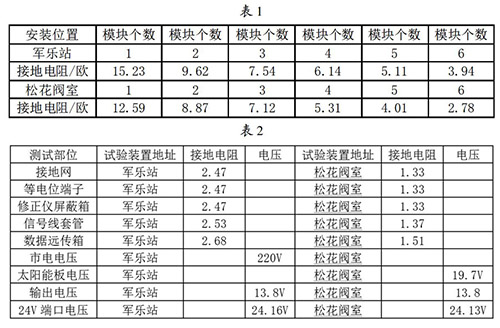 接地網的安裝與連接:接地網是整個乙二醇流量計防雷試驗比較關鍵的一個內容,能不能準確的論證試驗的有效性,必須保證接地網達到標準的接地電阻,通過對實地地電阻率的測試,初步選擇6個接地模塊埋設并配用降阻劑使用,邊安裝邊測試直到達到標準值后才引入等電位箱。在軍樂站和松花閥室安裝模塊并測試數據見表1。