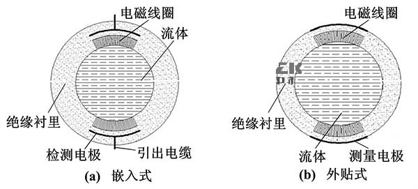 電極與被測流體通過絕緣管形成檢測電容,通過此電容來藕合流量信號。其主要的結構形式按照電極的安裝位置可以分為兩種:電極嵌人測量管的絕緣襯里內部(嵌人式)、電極貼在測量管外部(外貼式)。嵌入式結構與普通管道式電磁流量計結構相似,而外貼式大多是通過陶瓷表面金屬化技術將電極貼在測量管外。