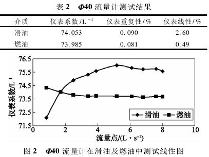 依據表1測試數據,經計算可得,Φ40流量計在滑油及燃油中測試結果如表2所示,測試線形圖如圖2所示。