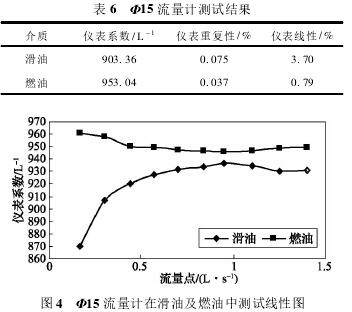 依據表5測試數據,經計算可得,Φ15流量計在滑油及燃油中測試結果如表6所示,測試線性圖如圖4所示。