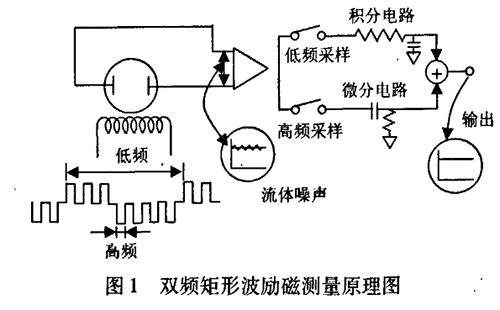 雙頻矩形波勵磁測量原理如圖l所示,一個由高低頻分量迭加而成的電磁場通過勵磁線圈被施加到被測液體中,勵磁波形是在一個低頻矩形波上迭加一個高于市電頻率的矩形波而得到的波形。在產生的電動勢中,低頻分量通過一個大時間常數的積分電路獲得一個零點穩定性好的平穩流量信號。而由漿液或低電導率流體產生的低頻噪聲可被不受噪聲影響的高頻采樣電路所抑制,有著同樣時間常數的流量信號經過一個差分電路以確定流速信號的變化,把這兩種不同頻率采樣所得的信號結合起來可獲得一個穩定流速信號,該信號不受噪聲干擾,且有較高的零點穩定性。