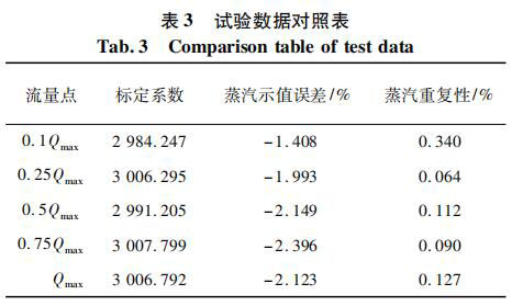 測試對象為同一臺表,DN80 口徑,帶有在空氣標定裝置上的 5 點標定系數。將管道介質設定為過熱蒸汽,并預設溫度為 160 ℃ 和壓力 0. 4 MPa,以便儀表計算過熱蒸汽的密度。試驗數據對照如表 3 所示。