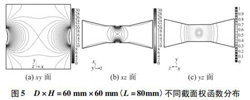 4) 圖 3( c) 、圖 4( c) 的 yz 面權(quán)函數(shù)分布表明,D = 90 mm時(shí)的權(quán)函數(shù)等勢線間距略大于 D = 60 mm 時(shí)的權(quán)函數(shù)等勢線間距,權(quán)函數(shù)變化梯度較小,且中心區(qū)域的權(quán)函數(shù)等勢線逐漸變?yōu)橹本€,因此 D = 90 mm 的權(quán)函數(shù)分布更均勻一些,但是兩者區(qū)別很小,即寬度改變對 yz 面權(quán)函數(shù)分布影響很小。圖 4( c) 、圖 5( c) 的 yz 面權(quán)函數(shù)分布表明,H = 30 mm時(shí)的權(quán)函數(shù)等勢線間距較大,且中心區(qū)域的權(quán)函數(shù)等勢線逐漸變?yōu)橹本€,因此 H = 30 mm 的權(quán)函數(shù)分布更加均勻;