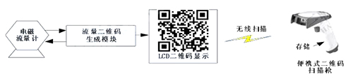 二維碼生成模塊定時向插入式電磁流量計發送采集指令,后者收到指令后發送流量數據。