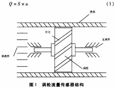 渦輪流量傳感器輸出的脈沖信號頻率F=Nxn(N是渦輪葉片數,n是渦輪的旋轉速度);流過渦輪流量傳感器的被測流體體積流量Q=Sxu(S是流體的流通截面積,u流體介質的流速);渦輪流量