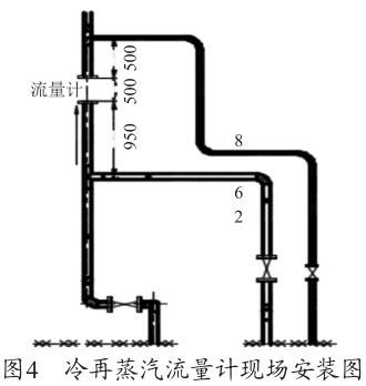 根據圖1渦街流量安裝要求示意圖及廠家的設備說明書要求,流量計上游的直管段長度至少為20D≈1 300mm,下游的直管段至少在5D≈325mm,D=65mm 為管道直徑。圖4為冷再蒸汽流量計現場安裝圖,流量計上游僅為950mm<1600mm,此流量計安裝位置有誤,對測量值有一定的影響,造成測量偏差,需調整流量計的安裝位置。