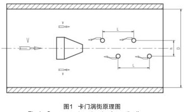 煙氣流量計實現流量測量的理論基礎是流體力學中**的“卡門渦街”原理,在流動的流體中裝置一個非線性三角柱形體,即渦旋發生體,如圖 1 所示。當流體沿渦旋發生體繞流時,會在渦旋發生體下游產生兩列不對稱,但有規律交替地分離釋放出一系列漩渦束,只有當兩渦漩列之間的距離 h 和同列的兩渦漩之間的距離 L 之比滿足 h/L=0.281 時,所產生的渦街才是穩定的。