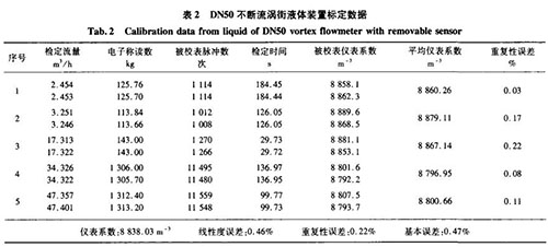 分別用精度0.5級音速噴嘴氣體標定裝置、精度0.2級稱重法水標定裝置對DN50口徑的不斷流渦街進行實際標定,其標定數據如表1、表2所示。