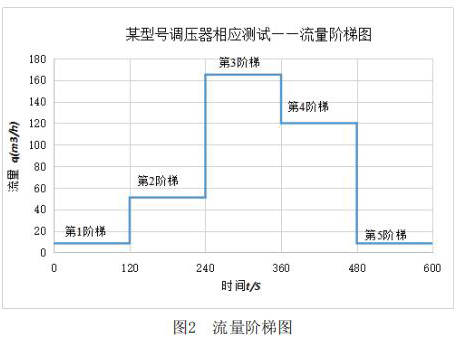 該測試主要利用實驗室測試條件,模擬客戶現場使用情況。其主要測試內容包括:測試電磁流量計在+23℃,-30℃和-40℃三種溫度下,電磁流量計出口壓力分別在2.1kPa和30kPa時,流量分別從*1階梯到*5階梯時的響應速度,客戶所提供的流量階梯如圖2所示。橫軸表示下游球閥開啟動作時間,縱軸表示高溫電磁流量計下游需要的流量q。