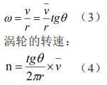 為了推導(dǎo)渦輪轉(zhuǎn)速和燃油質(zhì)量流率的關(guān)系,可先將渦輪展開(kāi),渦輪帶箭頭的斜線表示燃油流向。如果渦輪固定不動(dòng),流體流過(guò)葉片時(shí)將受到阻力,則當(dāng)燃油離開(kāi)渦輪的葉片時(shí),將產(chǎn)生一個(gè)切向速度 V。