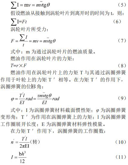 假設(shè)渦輪固定不動(dòng),燃油流過(guò)渦輪的葉片時(shí)將受到阻力,則當(dāng)燃油離開(kāi)渦輪的葉片時(shí),將產(chǎn)生一個(gè)切向動(dòng)量 mv,這個(gè)動(dòng)量即為渦輪獲得沖量 。