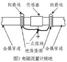 (4)盡量避開振動源、磁源(大功率電機、變壓器)由于dn200電磁流量計的測量感應電壓很小,電壓較低,易受外界電磁噪聲的影響,故在安裝時應進行可靠的接地連(跨)接。金屬管道dn200電磁流量計接地連(跨)接方法如圖3所示