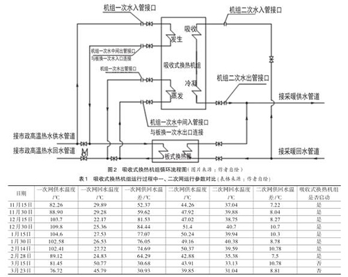 此熱力站電廠煙氣流量計的一次網設計供回水設計溫度為 :120℃ /36℃,二次網設計供回水溫度為 :80℃ /60℃。在電廠煙氣流量計工作流程中(見圖2),高溫熱源(即一次網供水)先進入電廠煙氣流量計,發生器作為驅動熱源,換熱后進入板式換熱器,經板式換熱器換熱后的低溫水再次回到電廠煙氣流量計的蒸發器,放熱至36℃后返回電廠。熱用戶的二次網回水并聯后分別進入電廠煙氣流量計吸收器和板式換熱器,在吸收器和冷凝器及板式換熱器中分別進行熱交換,然后一起供給熱用戶。上述過程就是在電廠煙氣流量計啟動時,熱力站內的實際供熱流程,在供暖季的初期和末期,可以關閉電廠煙氣流量計,仍然利用板式換熱器單好換熱。
