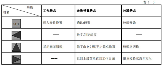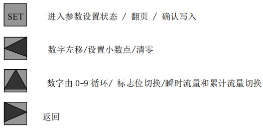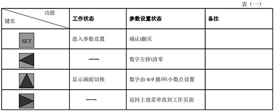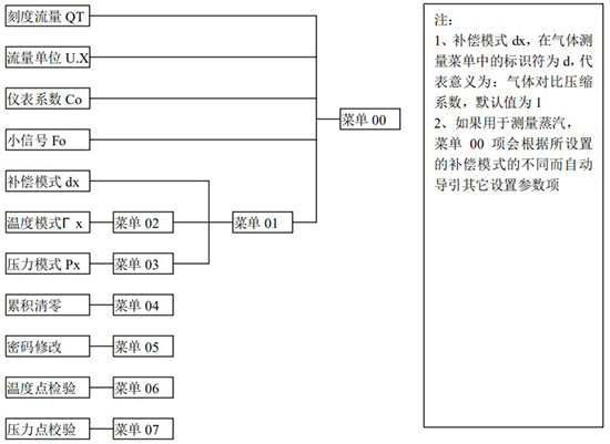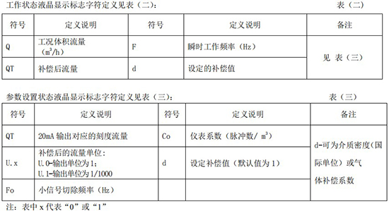 (3)標況流量計算公式(若補償后單位為 U.0):(4)標況流量計算公式(若補償后單位為 U.1):注:標況指 20℃,1 標準大氣壓三、一體化液晶顯示表頭參數(shù)設(shè)置操作說明(V03Z)1、鍵盤按鍵說明2、 顯示窗字符說明注:表中 x 代表“0”或“1”;Zn:標準狀態(tài)下(20℃,1 標準大氣壓),被測氣體的壓縮系數(shù),Z:工作狀態(tài)下被測氣體的壓縮系數(shù)3、 操作說明3.1、本儀表表頭采用自導引式和菜單式相結(jié)合的參數(shù)設(shè)置方式,所謂自導引式參數(shù)設(shè)置方式就是用戶在進入菜單 00 項后,表頭中的微電腦會自動導引用戶去設(shè)置需要設(shè)置的參數(shù)。另外,用戶也可以通過菜單模式分別對各組參數(shù)進行設(shè)置。蒸汽測量菜單框圖如下:3.2、參數(shù)設(shè)置約定:在設(shè)置各項參數(shù)時,提示符閃動代表該項參數(shù)沒有設(shè)置完或者尚未確認,可以通過按SET 鍵來確認或者按→鍵退出;提示符不閃動代表該項參數(shù)已設(shè)置完并確認,此時可以通過按 SET 鍵翻頁或者按→鍵退出。進入?yún)?shù)設(shè)置時,需要輸入密碼(6 位)并確認進入,為了防止誤進入?yún)?shù)設(shè)置菜單,保證儀表正常工作,在設(shè)置密碼時,使用↑鍵調(diào)數(shù)時不能循環(huán)調(diào)數(shù),只能單次調(diào)數(shù),只有密碼輸入正確進入各項參數(shù)設(shè)置菜單后才可以對各位循環(huán)連續(xù)調(diào)整數(shù)據(jù)。3.3、儀表參數(shù)設(shè)置舉例:儀表出廠前各項參數(shù)已設(shè)置好,用戶無需設(shè)置。如果用戶需要設(shè)置某項參數(shù),請參照以下步驟,例如修改刻度流量值 QT:在工作狀態(tài)下,按 SET 鍵,顯示屏顯示 P,數(shù)字位為全零,8 秒鐘若無操作,自動返回工作狀態(tài)。輸入密碼 :按數(shù)字↑鍵和左移←鍵,輸入密碼數(shù) xxxxx(出廠時默認密碼為 000123),↑鍵調(diào)各位數(shù)字 0-9,每按 ←鍵一次數(shù)字向右循環(huán)一位,可通過多次按←鍵對整段數(shù)字清零,按→鍵可以返回工作狀態(tài)。菜單選擇項:按 SET 鍵確認,顯示屏顯示如右圖所示,末行“00”閃動調(diào)整該項值選擇不同參數(shù)設(shè)置菜單。該例直接按 SET 鍵進入菜單 00 項設(shè)置刻度流量:QT 閃動,*一步:*先進行小數(shù)點調(diào)整,可以通過←鍵對參數(shù)快速清零或者通過↑鍵進行小數(shù)點調(diào)整,調(diào)整完畢,按 SET 鍵確認(QT 仍閃動);*二步:數(shù)值調(diào)整,可以通過↑鍵對每位數(shù)字進行調(diào)整,按 ←鍵一次數(shù)字向右移動一位,調(diào)整完畢,按 SET 鍵確認,QT 停止閃動,該項參數(shù)設(shè)置完畢,可進行下一項參數(shù)設(shè)置或者退出另外,單位設(shè)置 U.X 和補償方式設(shè)置 dX 通過↑鍵調(diào)整修改。3.4、校驗項說明: 儀表出廠前,溫度和壓力通道已校驗設(shè)置好,無需用戶重新校驗。校驗通道有密碼保護,廠家不對外開放,如果需要重新校驗溫度或者壓力通道,請專業(yè)人員與廠家技術(shù)人員聯(lián)系。4、計算公式說明4.1、蒸汽測量計算公式(1)渦街流量儀表工況體積流量計算公式:(2)密度 d,單位 Kg/m3(3)質(zhì)量流量計算公式,單位 Kg/h:(4)質(zhì)量流量計算公式,單位 t/h:4.2、氣體測量計算公式----標況指 20℃,1 標準大氣壓(1)渦街流量儀表工況體積流量計算公式:(2)對比壓縮系數(shù) d(Zn/Z),單位 1(3)標況流量計算公式,單位 Nm3/h:P1—工況絕壓,PN—標況絕壓(Mpa),T1—工況熱力學溫度,TN—標況熱力學溫度(K)