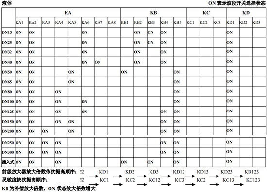 以上表值僅供參考,實際使用中因液體粘度和氣體密度不同應在此值附近調整,頻率低時可將 K3 向大口徑方向調一至三檔。頻率高時可將 K2 向小口徑方向調一至三檔。