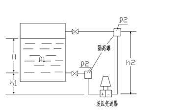 這時差壓變送器正壓室的壓力為:P+ = Hρ1+ h1ρ2+P0