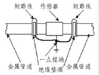 由于污水處理流量計(jì)的測量感應(yīng)電壓很小,電壓較低,易受外界電磁噪聲的影響,故在安裝時(shí)應(yīng)進(jìn)行可靠的接地連(跨)接。金屬管道污水處理流量計(jì)接地連(跨)接方法如圖3所示。