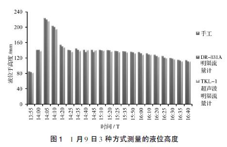 見圖3,以手工實(shí)測(cè)液位高度為基準(zhǔn),2種流量計(jì)的誤差均在±5%的范圍內(nèi)。除在1月9日14:40和14:45兩個(gè)時(shí)間點(diǎn)測(cè)量值表現(xiàn)出DR-831A測(cè)量誤差高于TKL-Ⅰ外,其他時(shí)段都明顯表現(xiàn)出DR-831A測(cè)量誤差小于TKL-Ⅰ。
