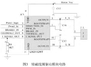 由于探頭尺寸較小,所產生的勵磁電流很弱,由于探頭尺寸較小,所產生的勵磁電流很弱,要處理這樣的信號,則后續的放大電路要有足夠高要處理這樣的信號,則后續的放大電路要有足夠高的輸入阻抗和較大的增益,來保證傳感器的靈敏度的輸入阻抗和較大的增益,來保證傳感器的靈敏度及抗干擾性;為了防止交流及抗干擾性;為了防止交流50Hz的工頻干擾,選的工頻干擾,選用方波電流作為勵磁電流,其頻率選用用方波電流作為勵磁電流,其頻率選用12.5Hz,它是1/4的工頻頻率,這樣可有效地抑制工頻干擾。勵磁信號在單片機內部生成,從*勵磁信號在單片機內部生成,從*26腳輸出12.5Hz方波信號,接到勵磁線圈的驅動模塊電路方波信號,接到勵磁線圈的驅動模塊電路IC5(LMD18200T LMD18200T)的3腳信號,它的內部采用腳信號,它的內部采用H橋式驅動,送出勵磁電流加到其橋式驅動,送出勵磁電流加到其2腳和10腳之間的勵磁線圈上。在勵磁線圈L上形成20~30mA方波電流,它與控制方波電壓同步。使流體運動切割波電流,它與控制方波電壓同步。使流體運動切割磁力線產生的方波電壓與勵磁電流完全保持同步, 磁力線產生的方波電壓與勵磁電流完全保持同步,這樣也便于在接收放大電路中信號的同步解調。電路如圖3所示。