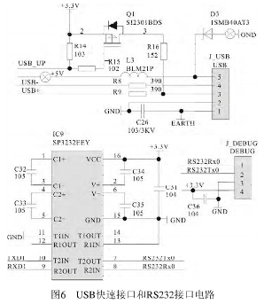 由Q1、R14、R15、R16、L3、D3、R8和R9等元件組成的電路與單片機對應電路,組成等元件組成的電路與單片機對應電路,組成USB快速接口電路??焖俳涌陔娐?。IC9(SP3232EEY)芯片與周圍元)芯片與周圍元件組成RS232接口電路。電路如圖6所示。