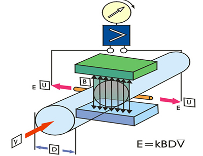 電磁流量計的工作原理是基于法拉*電磁感應定律。測量管內的導電介質相當于法拉*試驗中的導電金屬桿,上下兩端的兩個電磁線圈產生恒定磁場。當有導電介質流過時,則會產生感應電壓。管道內部的兩個電極測量產生的感應電壓。測量管道通過不導電的內襯(橡膠,特氟隆等)實現與流體和測量電極的電磁隔離,如圖所示。